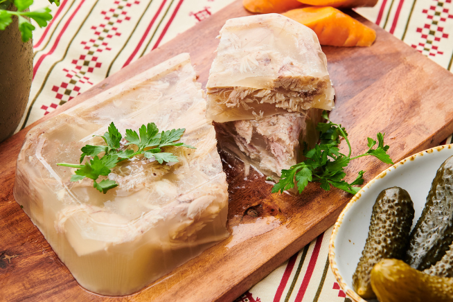 Acest preparat pe care îl găsești în meniul de Crăciun de la Family arată ordonat dacă alternezi felii sau pătrate egale și indici clar varianta pe platou, pentru a se diferenția de piftia de porc.