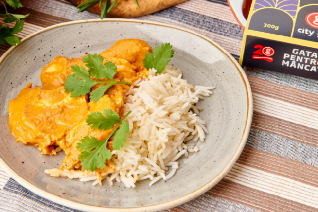 Pentru un prânz de familie cu specific internațional livrat acasă, porțiile complete cu orez sunt eficiente și ușor de porționat: pui tikka masala cu broccoli și orez basmati în porție de 900 g sau porc chinezesc cu varză china, ananas și orez sălbatic.